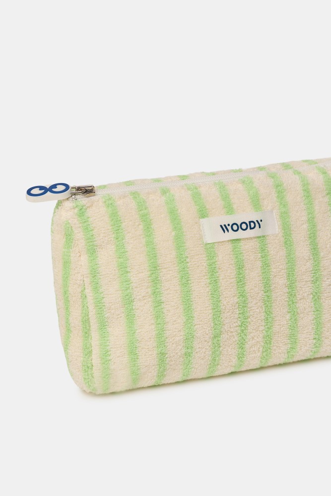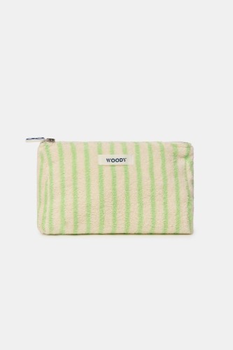 Groen-wit gestreept zakje van badstof. Gebruik het als toiletzak of pennenzak. Formaat 7x13cm.