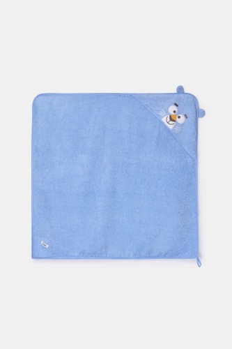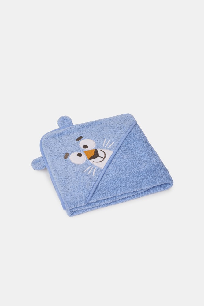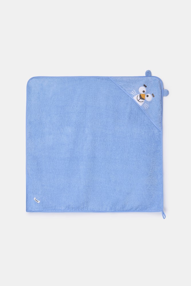 Blauwe badcape met kat op de capuchon. De badcape is gemaakt uit geweven badstof en heeft de afmeting 75x75cm.