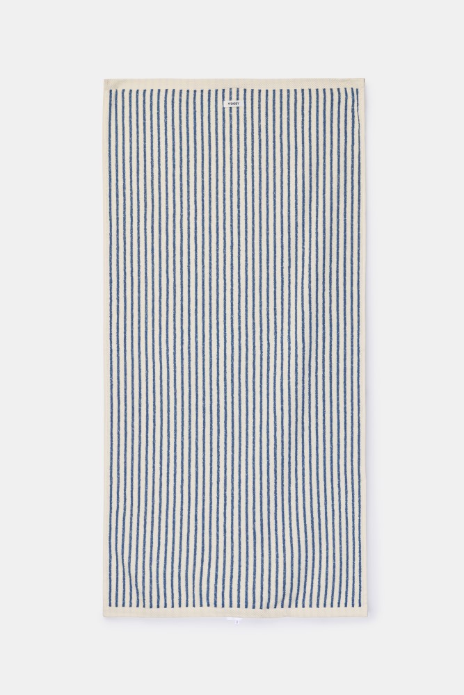 Blauw-wit gestreept strandlaken van badstof. Wordt geleverd in een bijpassende zwemzak van badstof met geborduurde giraf. Formaat handdoek 70cm x 140cm.