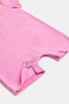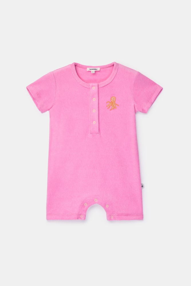 Roze kruippakje voor babyïs en peuters in Terry badstof, met een kleine kwallenprint geborduurd. Dit kruippakje met korte mouwen sluit zowel bovenaan als onderaan met drukknopen. Verkrijgbaar in maten 3M-2Y.