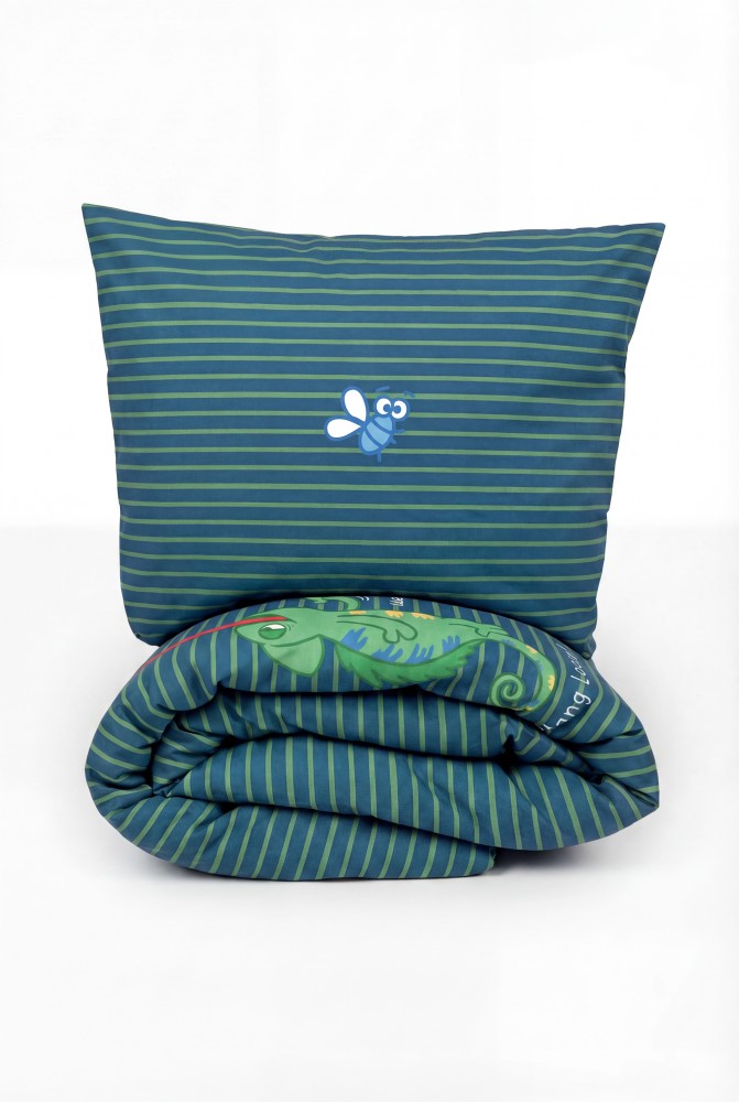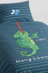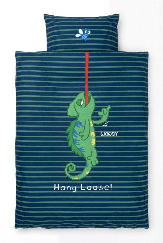 Eenpersoons dekbedovertrek met hoofdkussen van geweven katoen. Het overtrek is aan twee kanten te gebruiken. De ene kant heeft een gestreepte print met grote kameleon, de andere kant heeft een kleurrijke kameleonprint. De maat is 140x220cm en onderaan ishet overtrek voorzien van een flessenhalsopening om het onder de matras vast te steken.