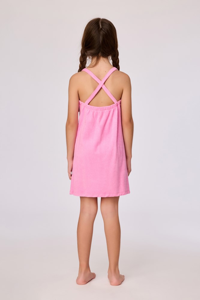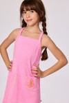 Roze strandjurk van badstof voor meisjes. Dit jurkje heeft spaghettibandjes die gekruist zijn achteraan, en zakken vooraan met een kleine dierenprint. Verkrijgbaar in maten 2Y-16Y.