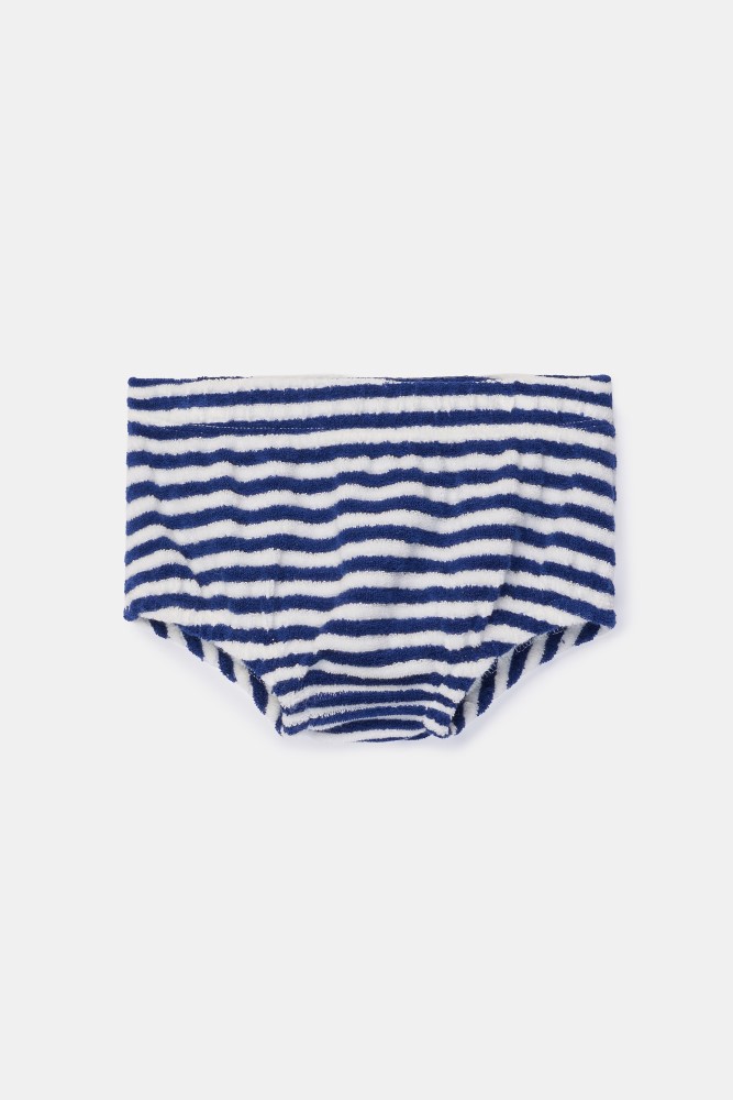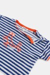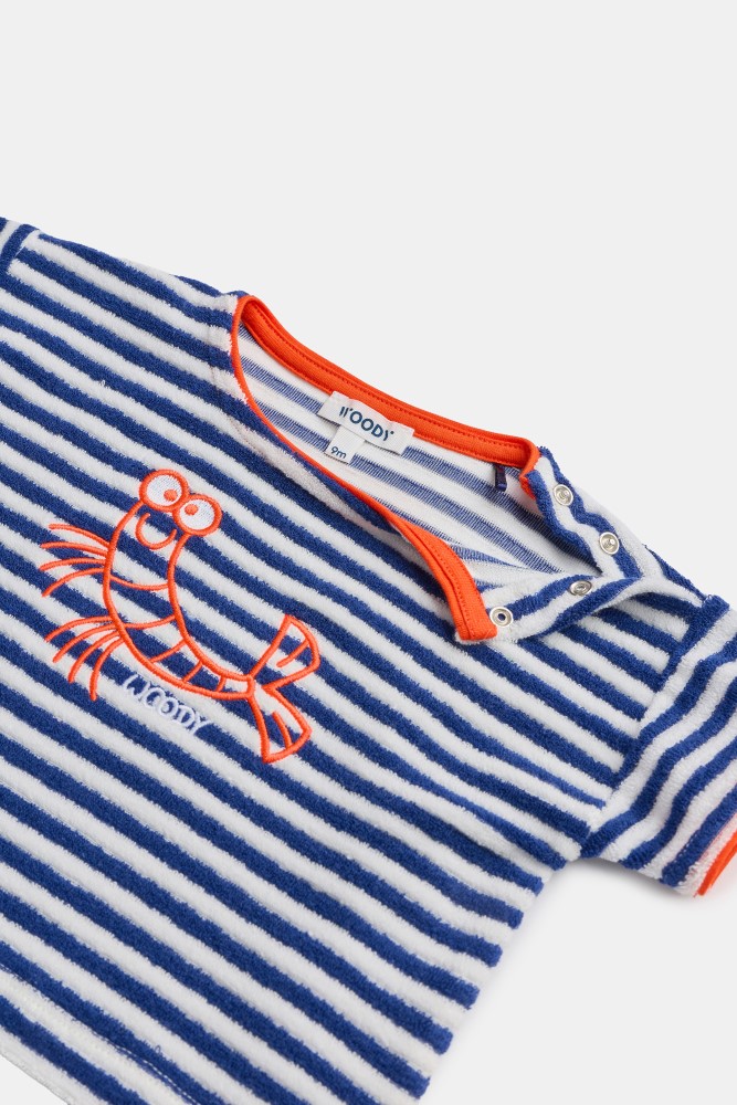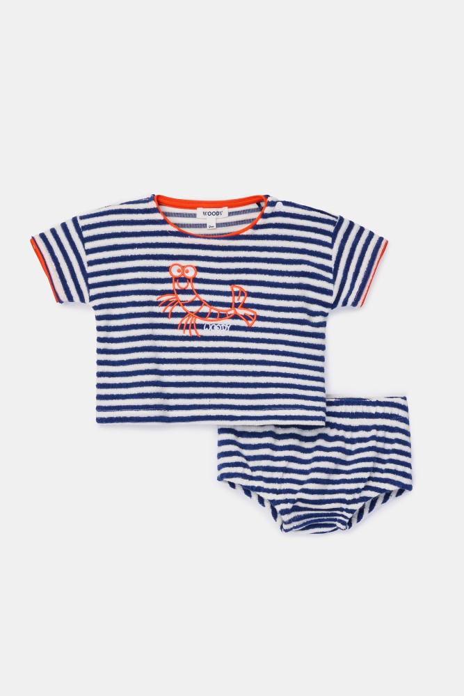 Tweedelige marineblauw-wit gestreepte set voor baby's en peuters in Terry badstof met contrastbies. Het gestreepte bovenstuk heeft een kleine kreeftenprint geborduurd, sluit aan de schouder met drukknopen en wordt gecombineerd met een gestreept bloomer broekje. Verkrijgbaar in maten 3M-2Y.